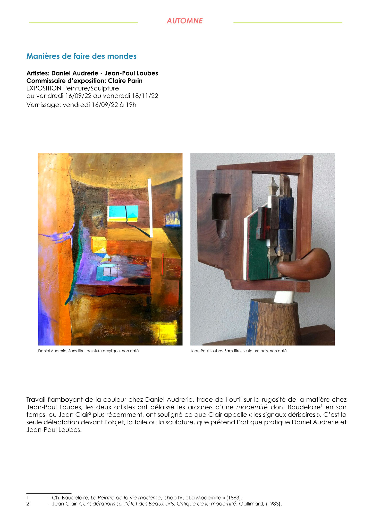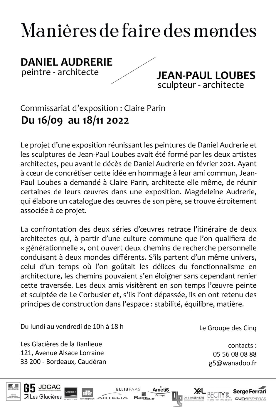 Le projet d’une exposition réunissant les peintures de Daniel Audrerie et les sculptures de Jean-Paul Loubes avait été formé par les deux artistes architectes, peu avant le décès de Daniel