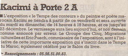 Lors de cette exposition exceptionnelle, le Groupe des Cinq présente une trentaine d’œuvres du peintre Kacimi. Sept conteurs, debout parmi les couleurs, font découvrir aux visiteurs des "sourates". Décédé en 2003, ce peinte marocain aura marqué de ses œuvres et de son engagement l'art contemporain.